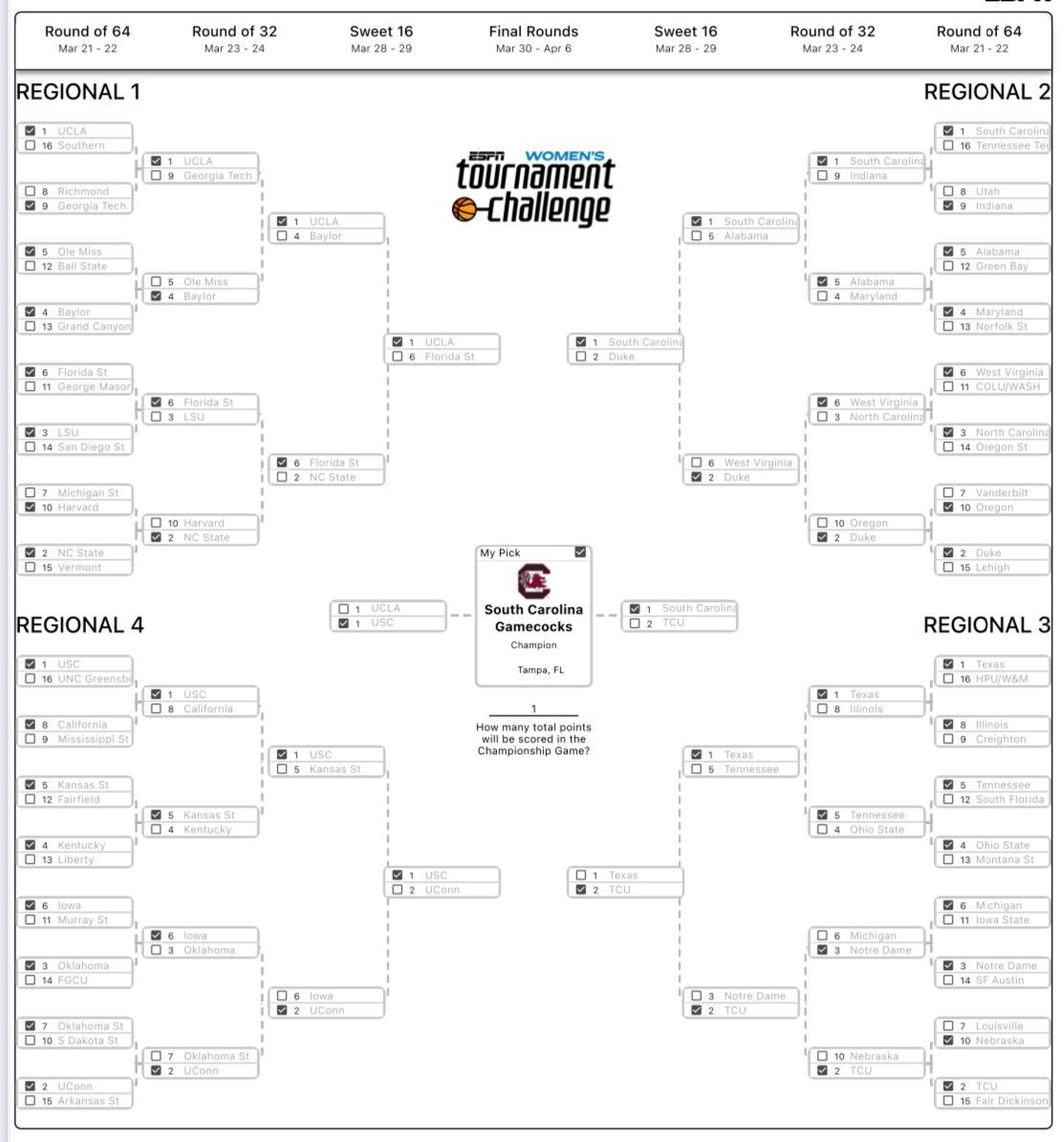 Joyce Edwards is primed for a breakout tourney, and MiLaysia Fulwiley will take care of things in the backcourt. The Cinderellas will be fun, and upsets are bound to happen, but I expect the Gamecocks to win it all yet again.