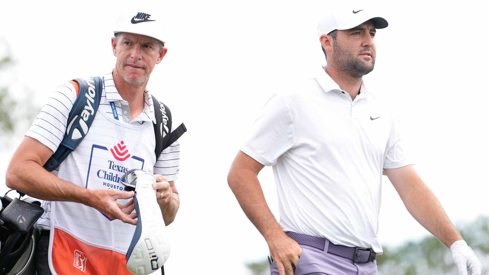 PGA Tour pro Scottie Scheffler and caddie Ted Scott walk during the Texas Children's Houston Open at Memorial Park Golf Course.