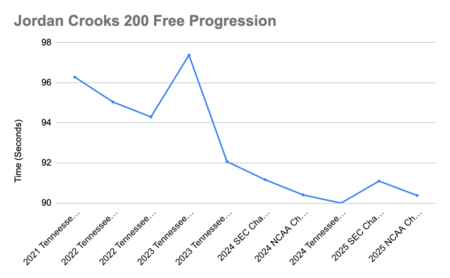 Crooks came into college as a full-on sprinter. He swam his first 200 free at the 2021 Tennessee Invit3 as a freshman, swimming 1:36.28. He also swam the event on a relay at the meet, splitting 1:35.85 from a rolling start. For context, his 50 free was 19.39 at the same meet, so he was still getting his feet underneath him in yards racing.